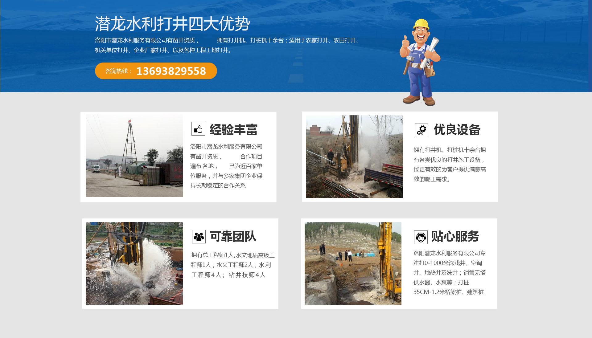 洛陽(yáng)市潛龍水利服務(wù)有限公司成立于2009年,注冊(cè)資金200萬(wàn)元,擁有河南省水井供水技術(shù)協(xié)會(huì)頒發(fā)的河南省水井施工單位壹級(jí)資質(zhì)證書(shū),公司擁有打井機(jī)、打樁機(jī)十余臺(tái);適用于農(nóng)家打井、農(nóng)田打井、機(jī)關(guān)單位打井、企業(yè)廠家打井、以及各種工程工地打井。洛陽(yáng)潛龍水利服務(wù)有限公司打0-1000米深淺井、空調(diào)井、地?zé)峋跋淳讳N售無(wú)塔供水器、水泵等;打樁35CM-1.2米橋梁樁、建筑樁等;代辦洗井業(yè)務(wù);農(nóng)業(yè)水利灌溉,土地開(kāi)發(fā)整理項(xiàng)目可行性研究、編制、規(guī)劃、設(shè)計(jì)、預(yù)算編制、標(biāo)書(shū)編制、水利技術(shù)咨詢服務(wù)。